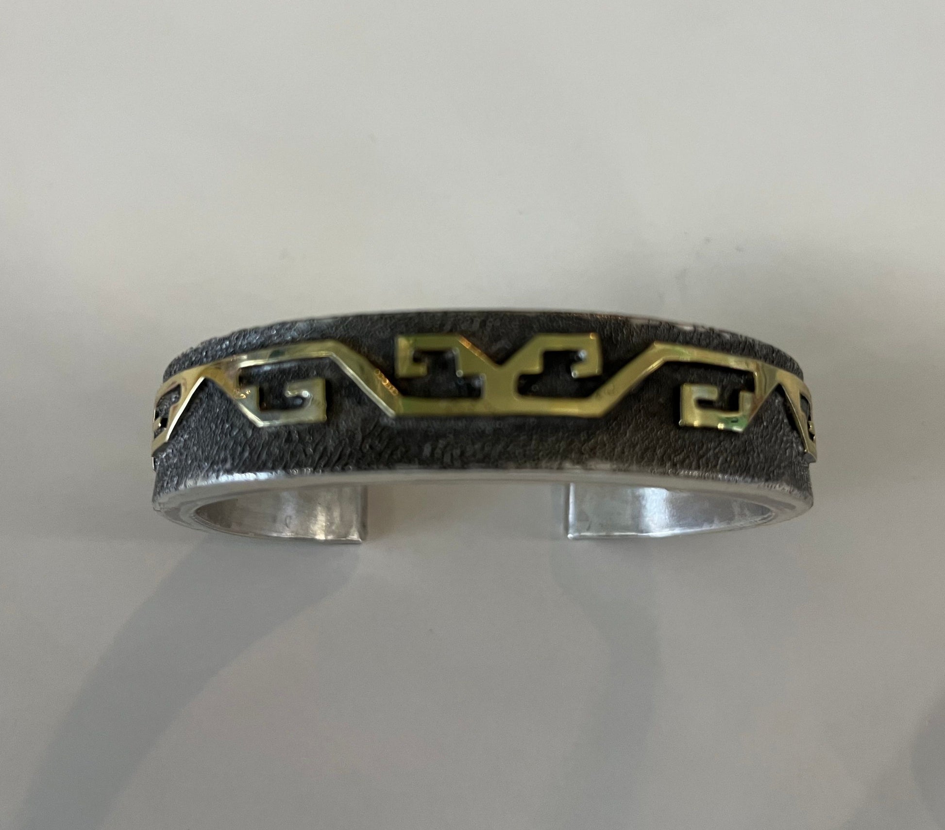 This bracelet weighs a hefty 4.3 ounces of solid sterling silver, with a modified Grecian Key overlay. Heavily antiqued background contrasts the highly polished gold filled design- a VERY classy piece that will last for several generations! This bracelet will fit an average masculine wrist or a large lady's wrist. It cannot be sized.