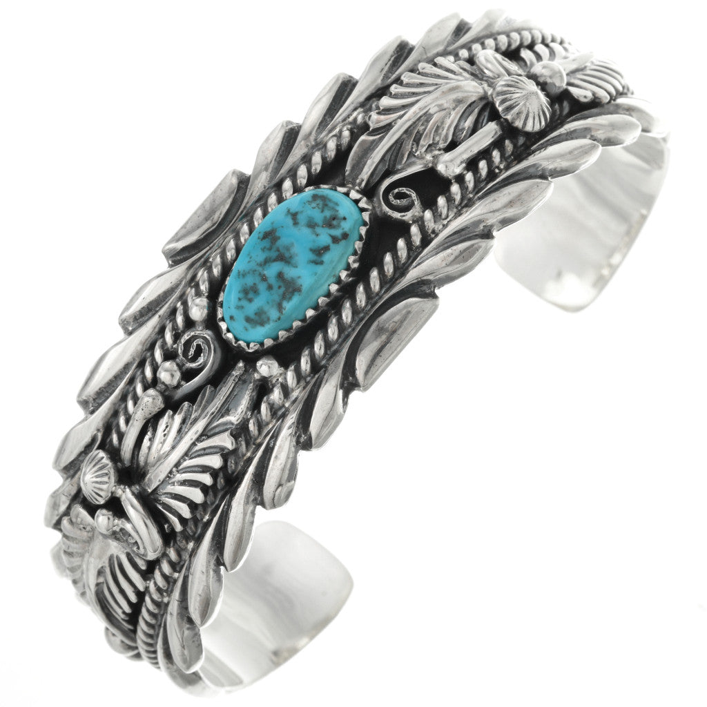 This Ladies Navajo Cuff Bracelet with Turquoise Nuggets is expertly crafted with a beautiful, natural Kingman stone, carefully bezel-set in a Sterling silver design. The Arizona stone is adorned with intricate leaf, drop, and swirl details, as well as twist wire and carved borders. Measuring 3/4” in width at the center and tapering slightly towards the back, this bracelet can be custom made for wrist sizes 6" to 7-1/2", with larger sizes available for an additional fee. Each piece is handcrafted by Native American artisans in our shop, and is stamped with the Sterling silver mark of quality. With its unique stone variations, this bracelet is a sophisticated and complementary addition to any outfit.
