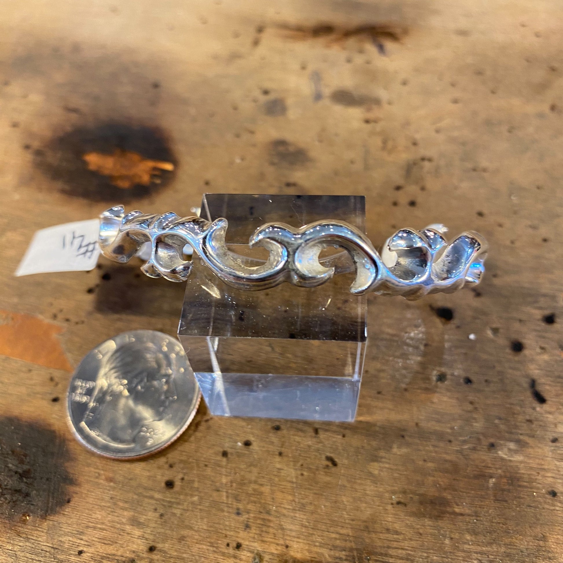 Here is a feminine sterling bracelet that will go with anything. It is solid and it looks heavy, but it rests nicely between wrist and hand for a very comfortable fit. And, it will add a sophisticated accent to any look. It was investment cast, in Grayhawk's shop.