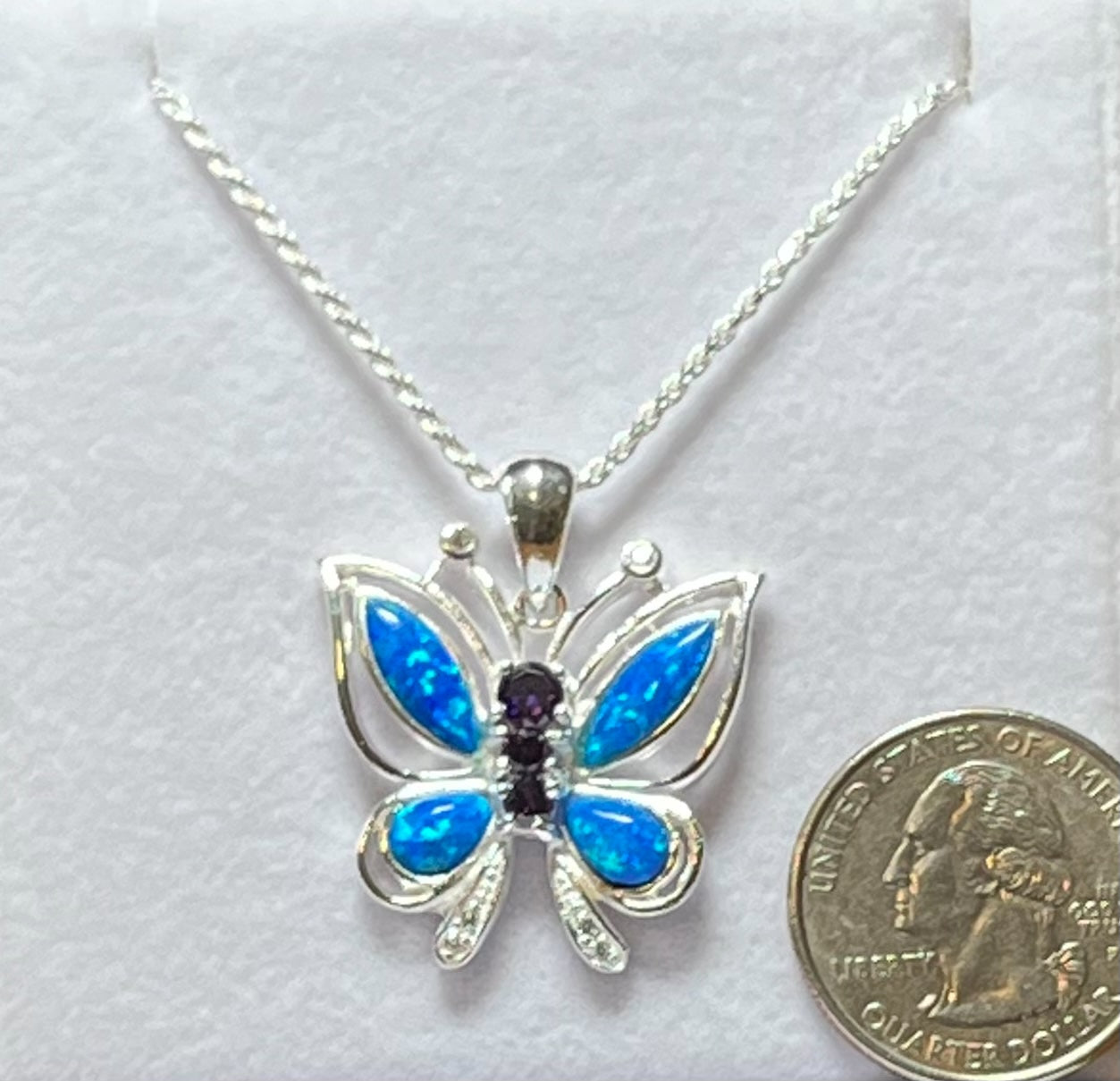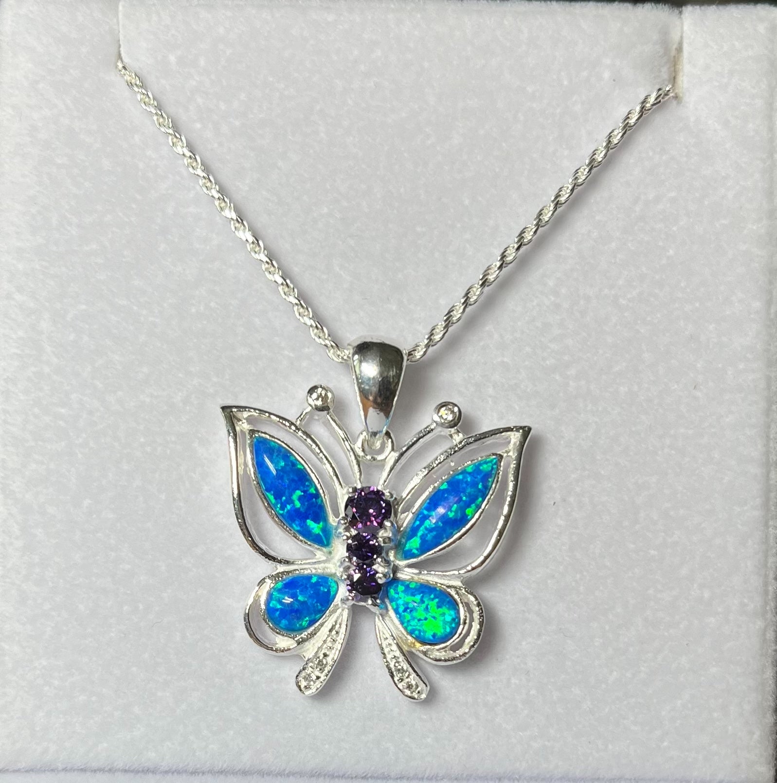 Sterling Silver Blue or White Opal Butterfly Pendant with Pink CZ
