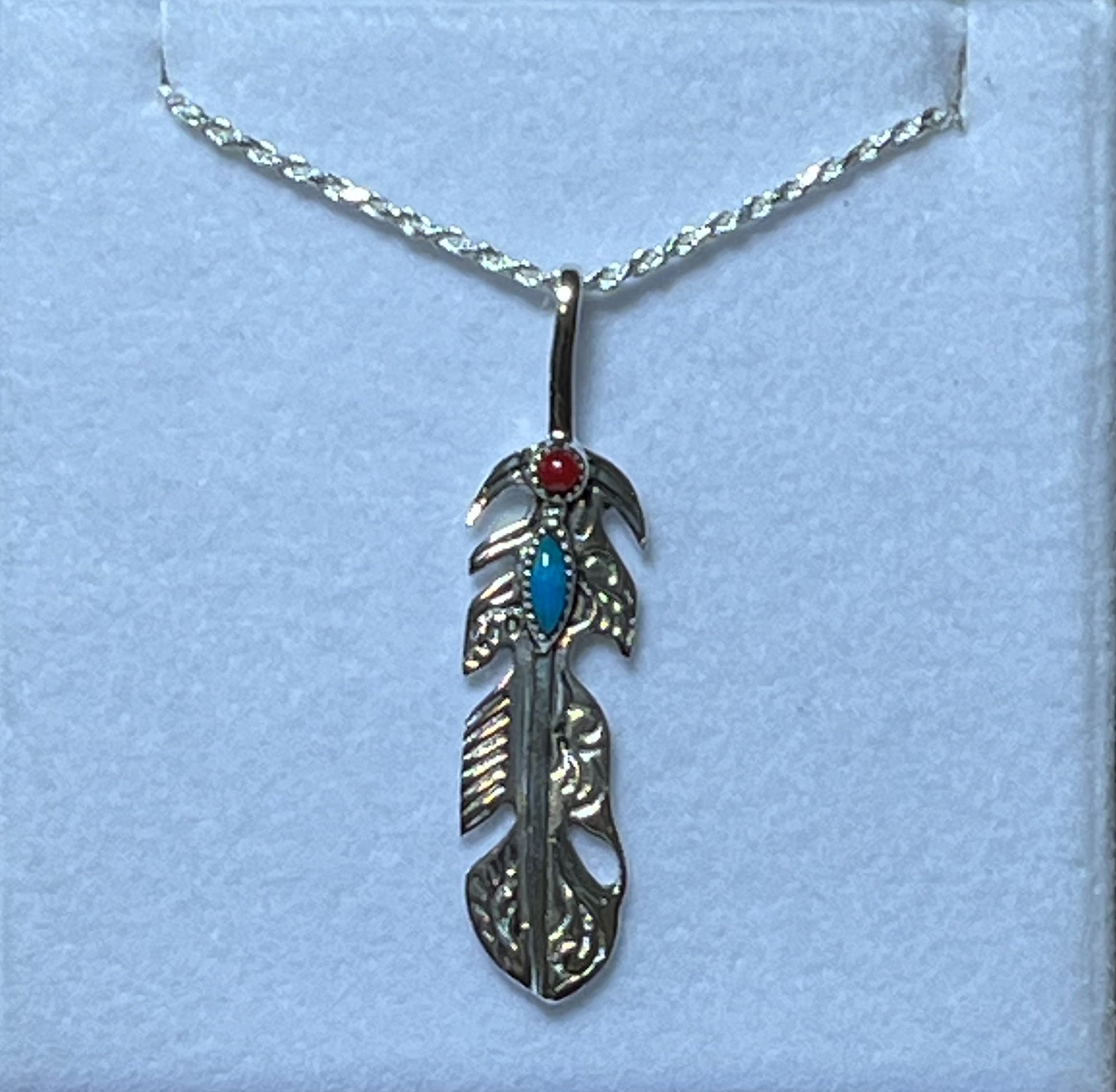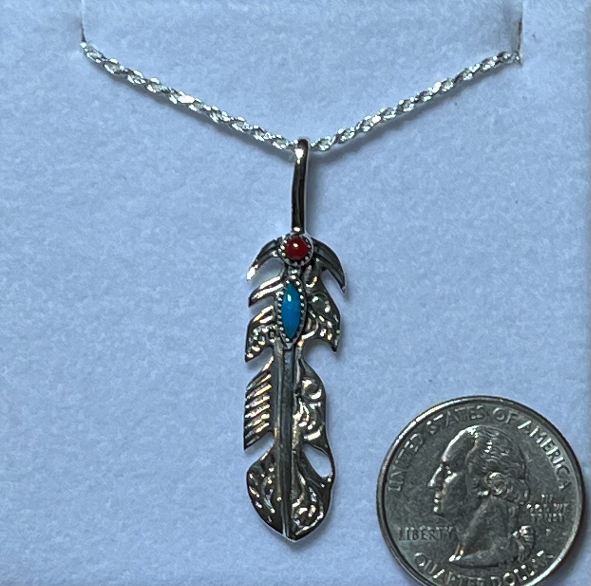 Sterling Silver Sterling Feather Pendant with Turquoise and Coral