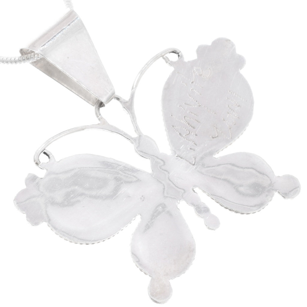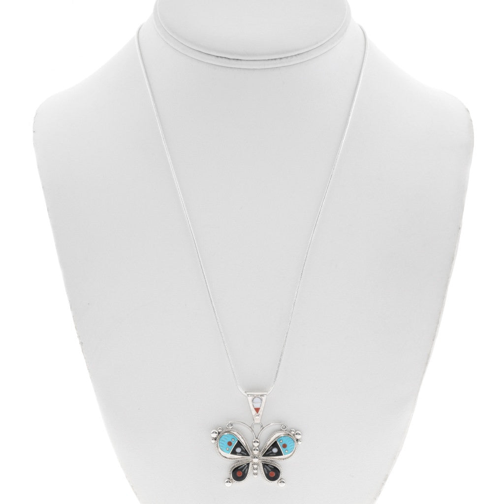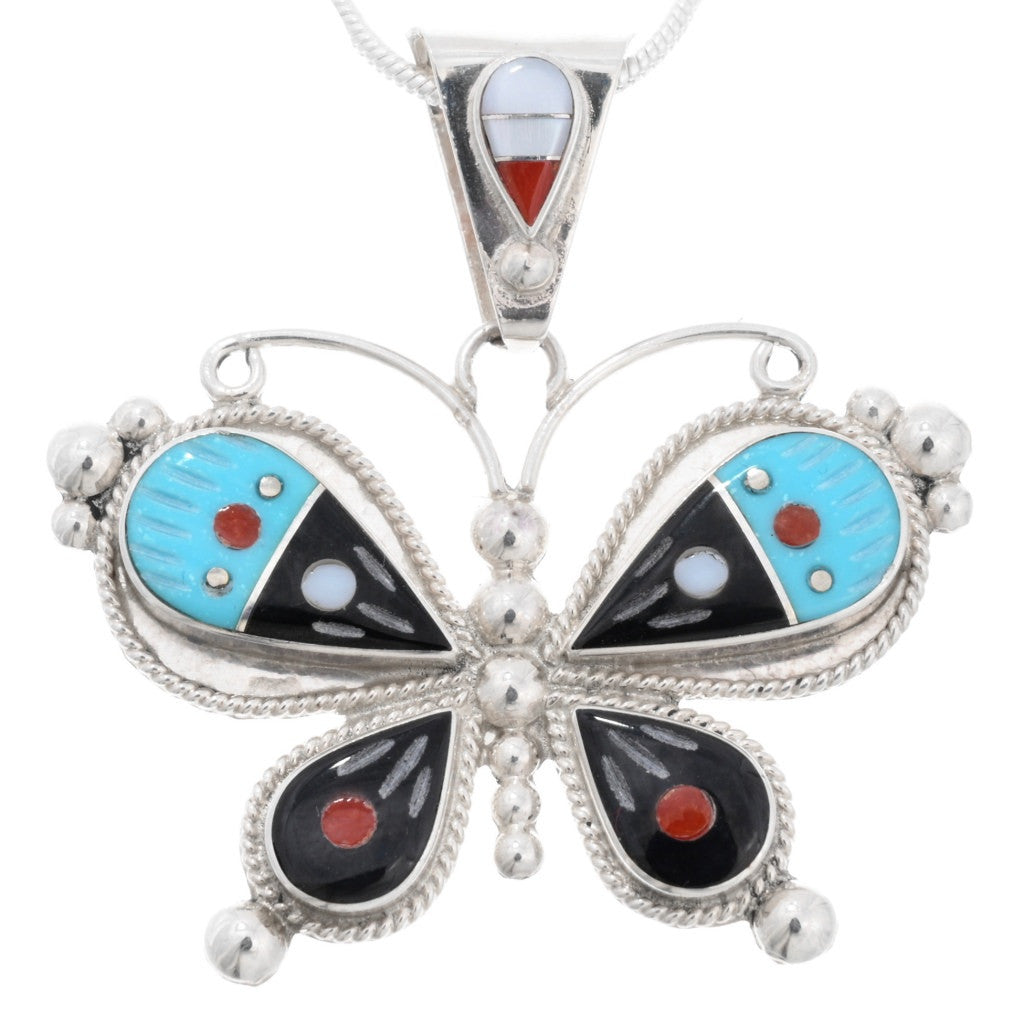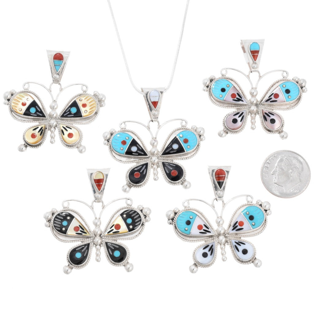 The Zuni Inlaid Butterfly Silver Pendant by Lyndon Ahiyite is a stunning portrayal of the symbol of metamorphosis! Genuine Sleeping Beauty Turquoise, Spiny Oyster, Mother of Pearl, Gold Lip, and Jet tiles are meticulously hand cut and set in Sterling Silver. The piece is adorned with delicately curled wire antenna, drops, and twist wire accents, measuring approximately 1-1/2" long and 1-1/2" wide, with a 6mm bail. It includes a complimentary non-sterling chain. Lyndon Ahiyite, the Zuni artist, has hand signed the piece. This Zuni Inlaid Butterfly Silver Pendant is a graceful tribute to nature and a wonderful gift. Each pendant is individually crafted, so the inlays may vary slightly, as shown in the group photo. Chain not included.